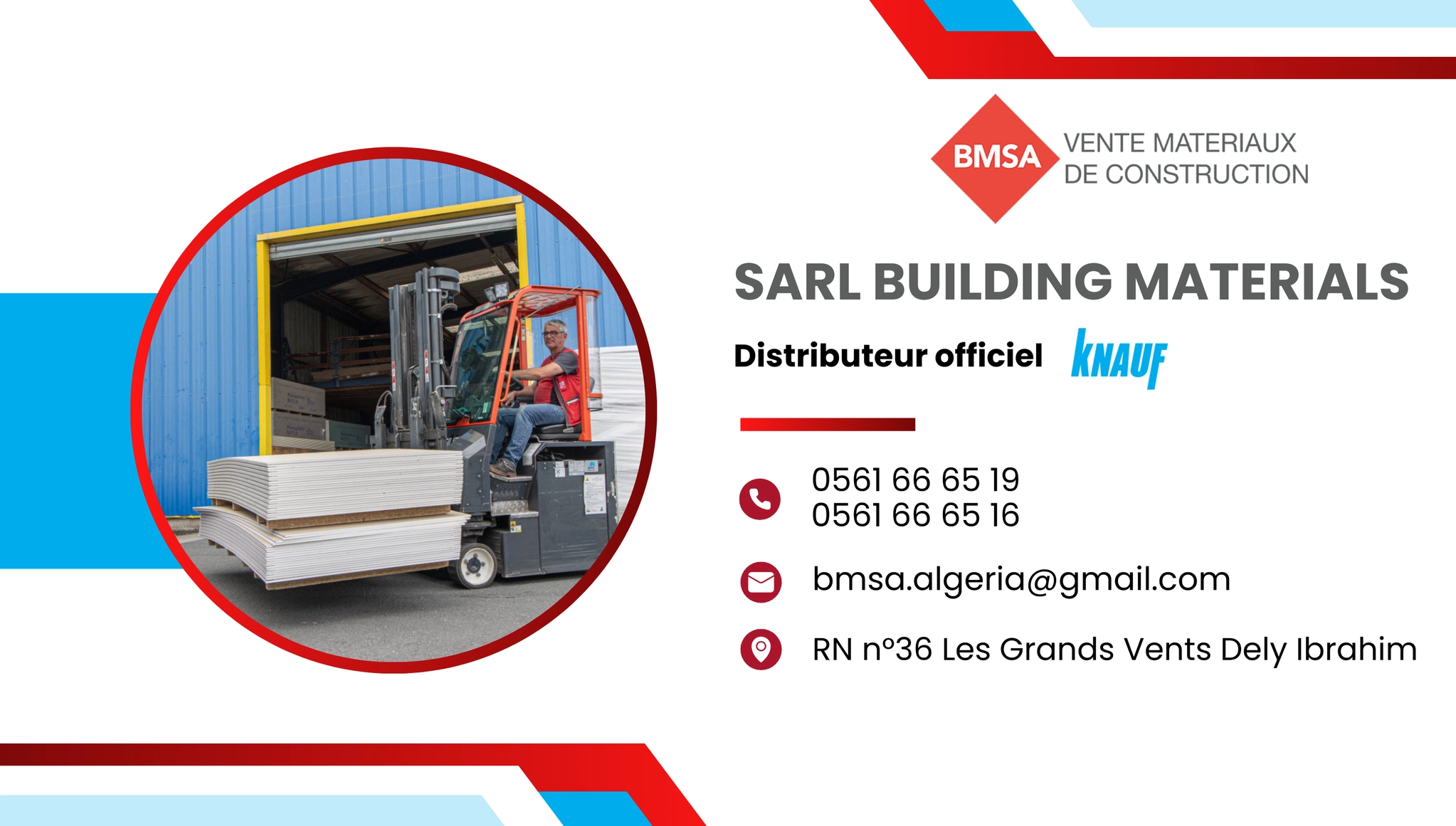 La Sarl Building Materials Sales Algeria (BMSA) s’impose aujourd’hui comme un acteur incontournable dans la distribution de matériaux de construction à Alger et dans ses environs. Située à Route de Ouled Fayet, Les Grands Vents, Dely Ibrahim, notre entreprise s’adresse aux professionnels du bâtiment, architectes, entreprises de BTP ainsi qu’aux particuliers souhaitant bénéficier de produits fiables, certifiés et durables. Spécialisée dans la vente de plaques de plâtre, d’enduits en poudre ou en pâte, de plâtres de construction et colles, de structures métalliques, d’accessoires pour le montage, ainsi que d’outillage, BMSA propose une large gamme de références répondant aux standards des plus grandes marques comme Knauf, Taouab, TERRACO, Semin, AKIFIX, etc. Grâce à une logistique performante, un service client à l’écoute, et un stock toujours disponible, nous sommes en mesure d’accompagner efficacement tous vos projets de second œuvre, d’aménagement intérieur ou de rénovation.